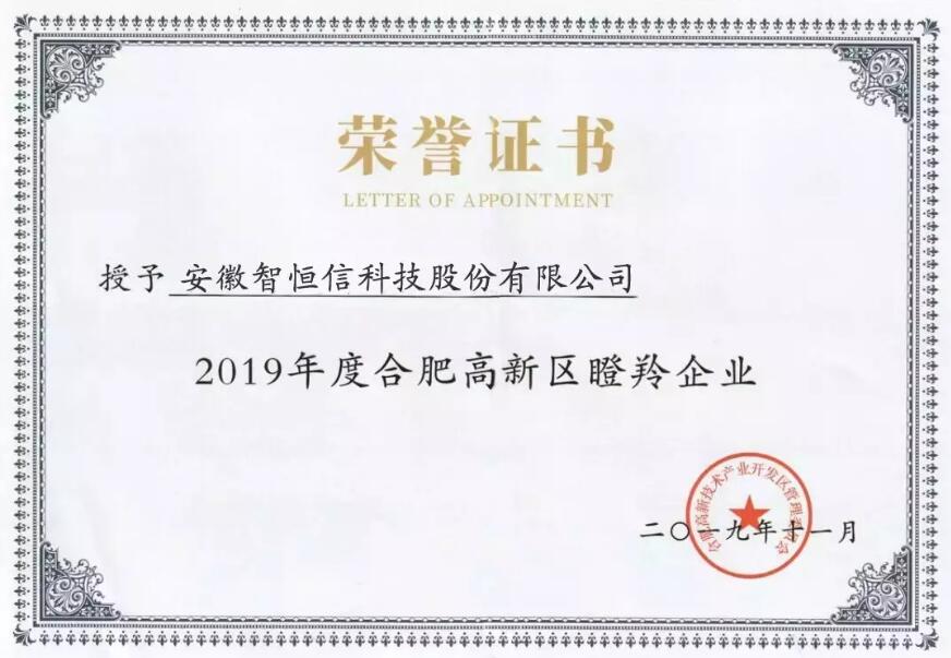 11月20日,合肥高新区高成长企业发布会在管委会一楼报告厅举行,会上发布了《合肥高新区2019年度高成长企业榜单及发展报告》,安徽金年会获颁2019年度合肥高新区瞪羚企业。